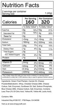 Ingredients: Green Fried Plantain, Canola Oil, Cheese Powder(Maltodextrin, Whey, Cheddar Cheese (Milk, Cheese Culture, Salt, Enzymes), Sunflower Oil, Salt, Sodium Phosphate, Blue Cheese (Milk, Cheese Culture, Salt, Enzymes), Contains Less Than 2% Of Citric Acid, Yellow #5, Yellow #6, Lactic Acid).
